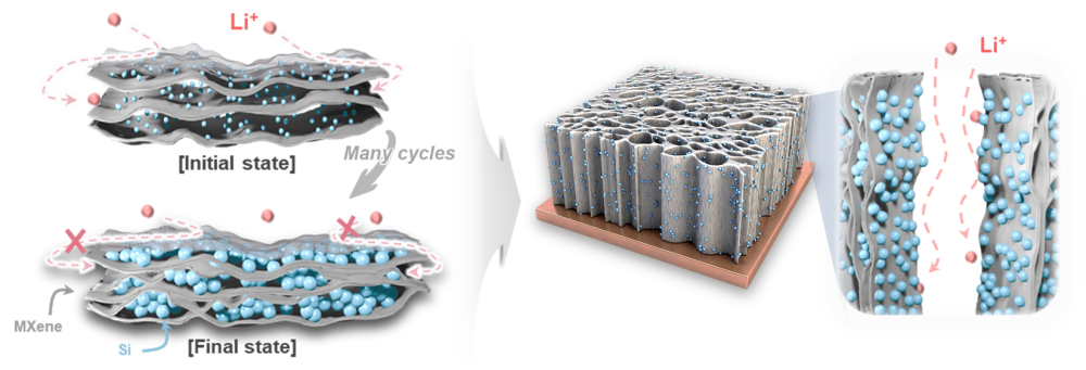 Despite its exceptionally high theoretical capacity, which far exceeds that of conventional graphite, the silicon anode suffers from severe volumetric expansion and intrinsically low electrical conductivity, factors that critically hinder its practical application in high-energy Li ion batteries. To overcome these limitations, a vertically aligned Si@MXene (V-Si@MX) composite electrode was fabricated via directional freezing followed by freeze-drying. This architecture offers unidirectional pathways for ion and electron transport, interconnected pores, and strong interfacial bonding between Si and the MXene host, thereby effectively mitigating volume changes while enhancing charge transport. Electrochemical testing revealed superior performance relative to conventional electrodes, including high-rate capability (delivering about 1,500 mAh g-1 at up to 3 C), long-term cycling stability, low charge-transfer resistance, and a high Li+ diffusion coefficient. These results demonstrate that vertical structural engineering represents a promising and scalable approach for developing high-performance Si-based anodes.